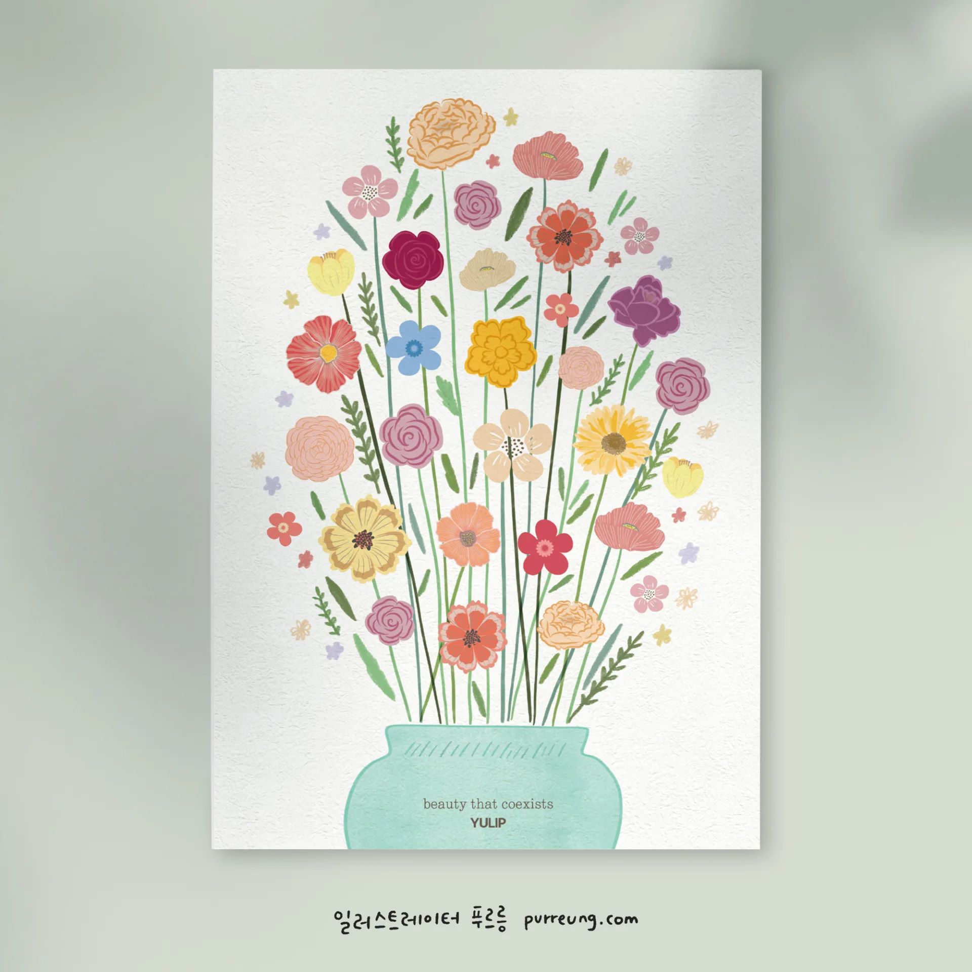 율립의 고객경험증진을 위한 엽서를 제작했습니다. 율립은 100% 천연 유래, 유해 성분이 없는 립스틱과 다양한 세럼을 판매하고 있으며 지속가능성을 위한 여러 활동을 함께 하고 있습니다.(홈페이지 참고) 이런 율립의 무드에 맞게 차분하고 감성적인 톤으로 꽃 일러스트를 작업했습니다.